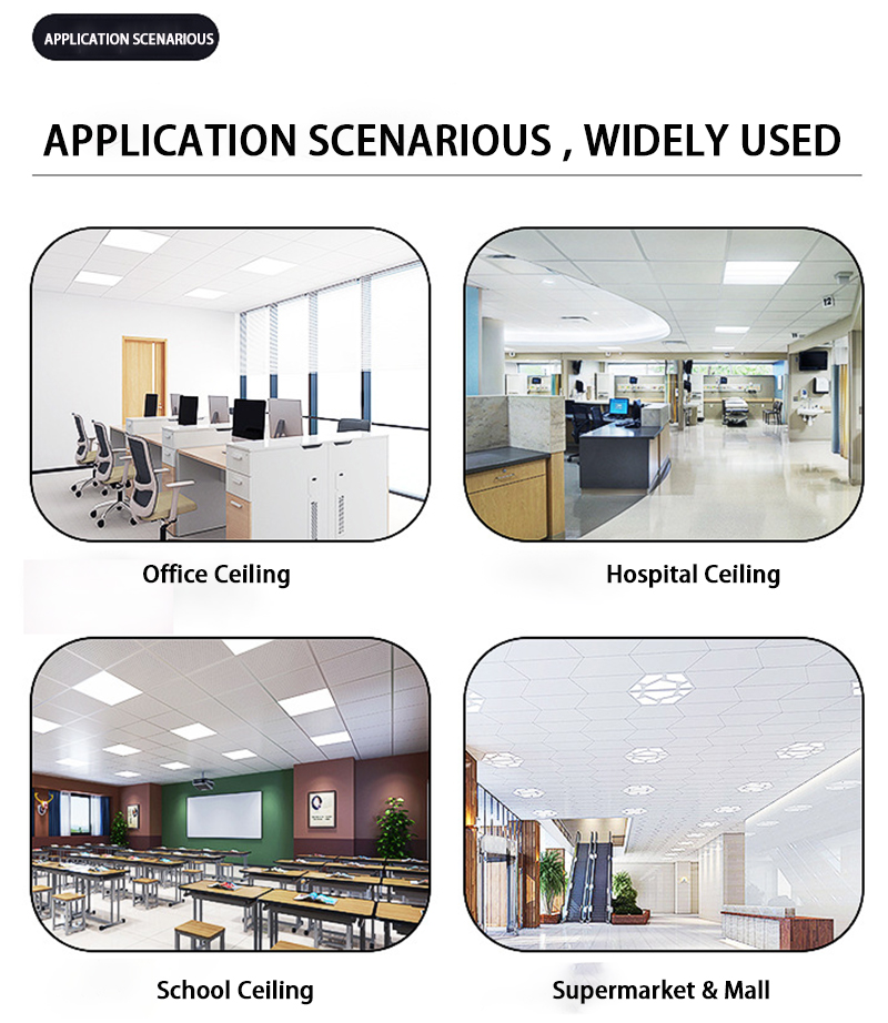 - Grid Ceiling Panels: Designed to fit perfectly into the standard exposed grid systems, similar to traditional ceiling tiles but with a modern metallic finish.